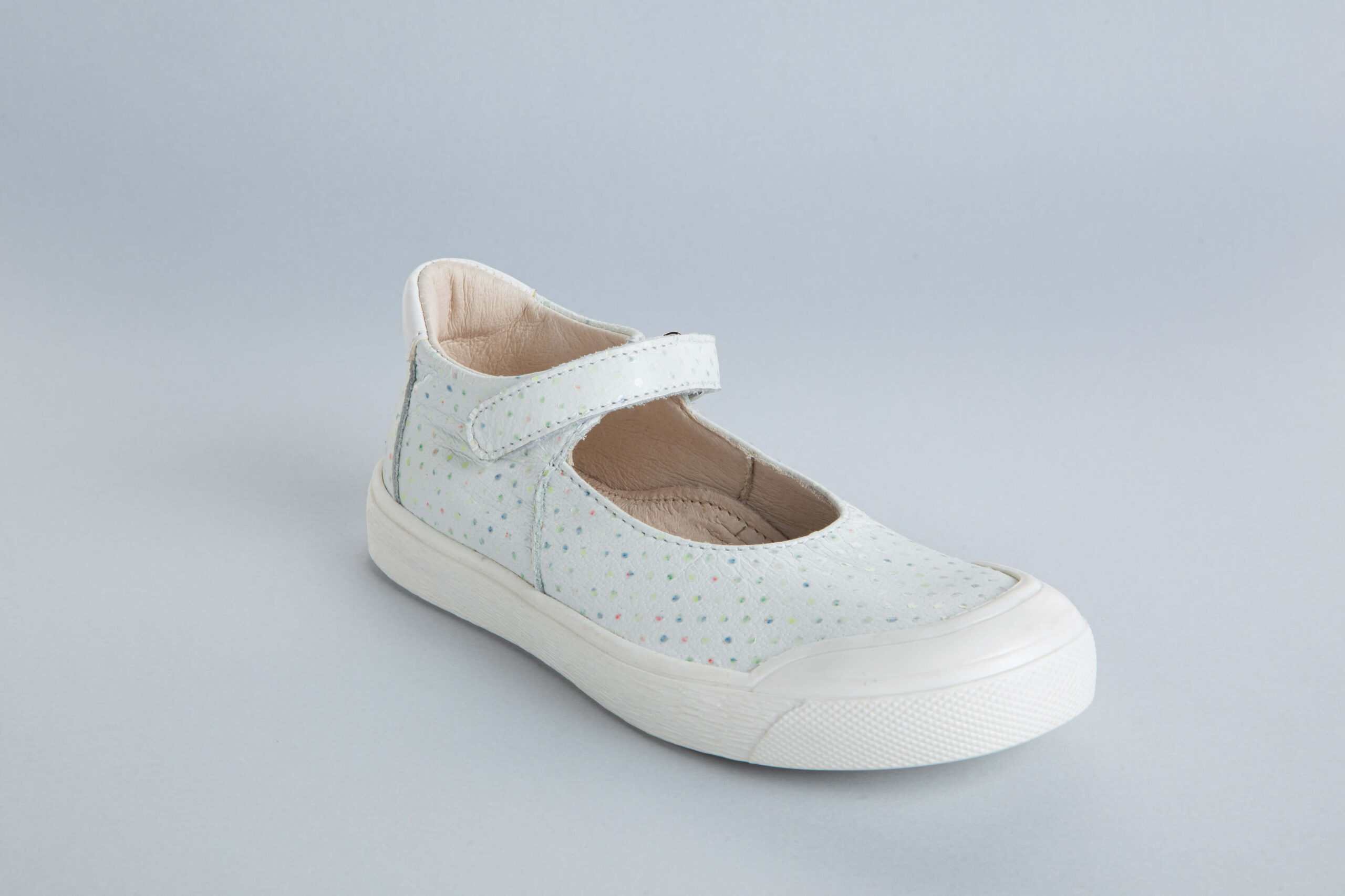 Babies en cuir blanc à petits pois multicolores. Robe, jupe ou pantalon, ces chaussures s’accordent avec pratiquement tout, voila pourquoi vous les aimerez tant !