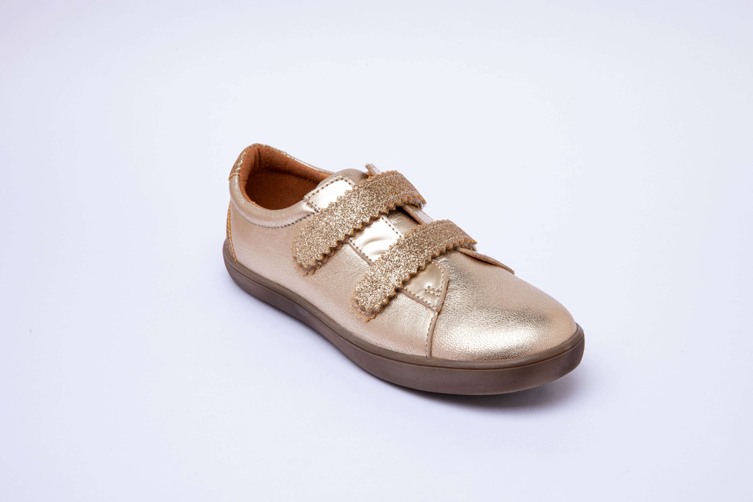 Baskets en cuir doré à scratch pailletées, idéales pour des occasions spéciales & pour les fêtes d’anniversaire. Elles apporteront une touche de glamour à la belle tenue de votre enfant. Une pépite incontournable dans les dressings des petites !