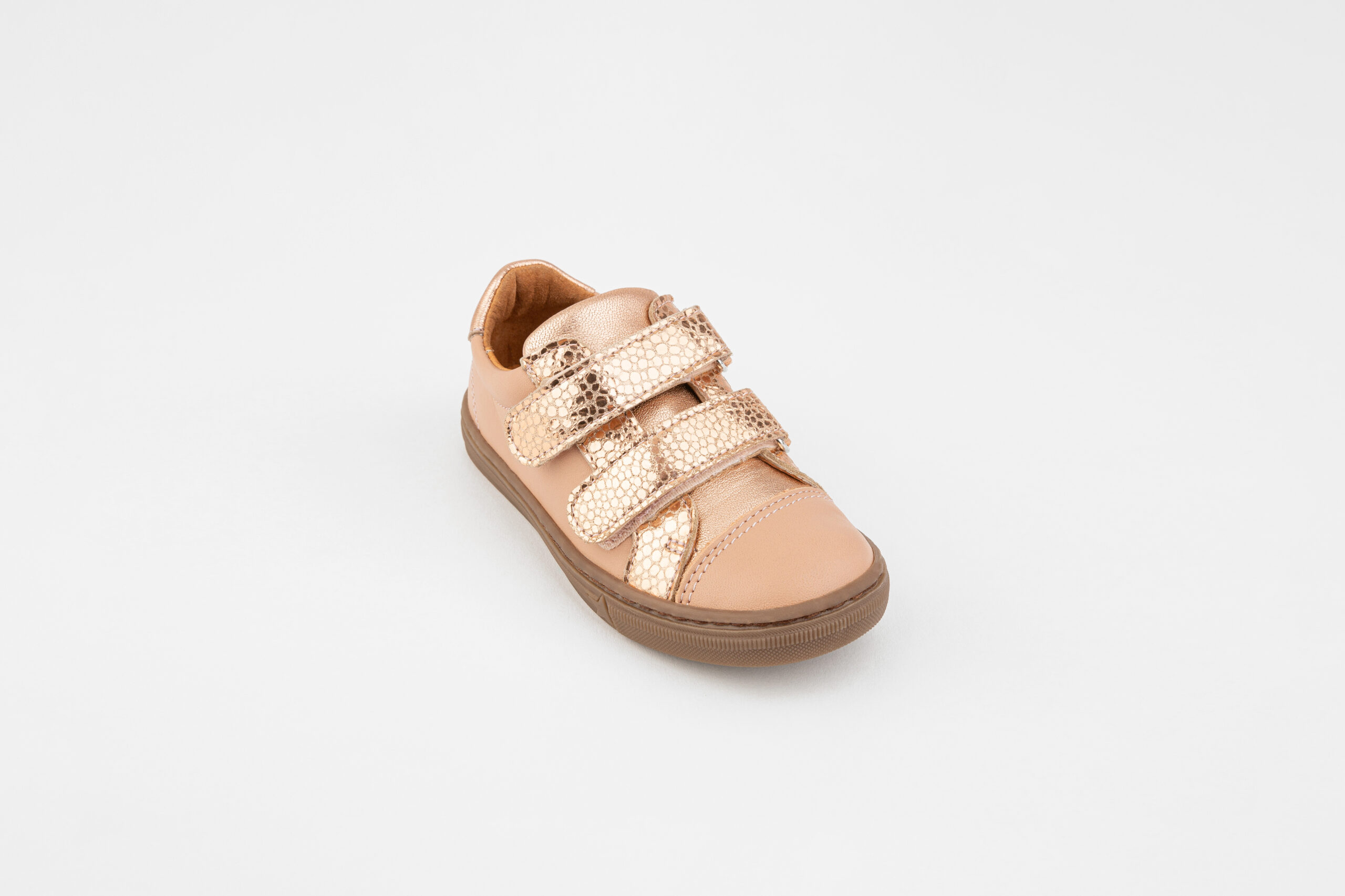 Charmantes baskets fillette aux reflets pailletés rosés, décorés de deux brides scintillantes. La semelle crantée apporte une touche de dynamisme à ce modèle à la fois élégant et confortable pour les jeunes filles.