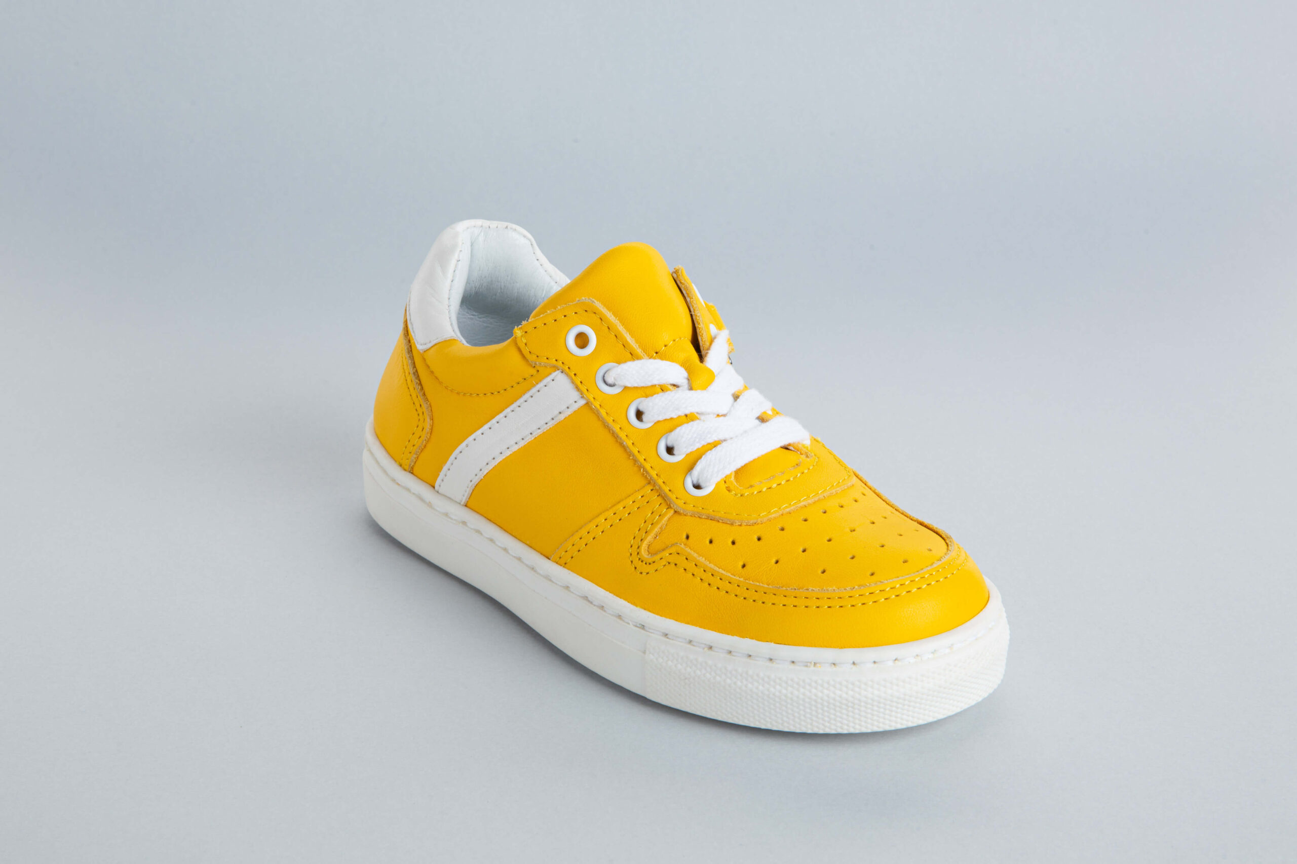 Tennis basses en cuir souple jaune citron, faciles à enfiler grâce à la fermeture éclair sur le coté en plus des lacets. Une paire mode et confort pour se déplacer en legerté à la cours de récré !