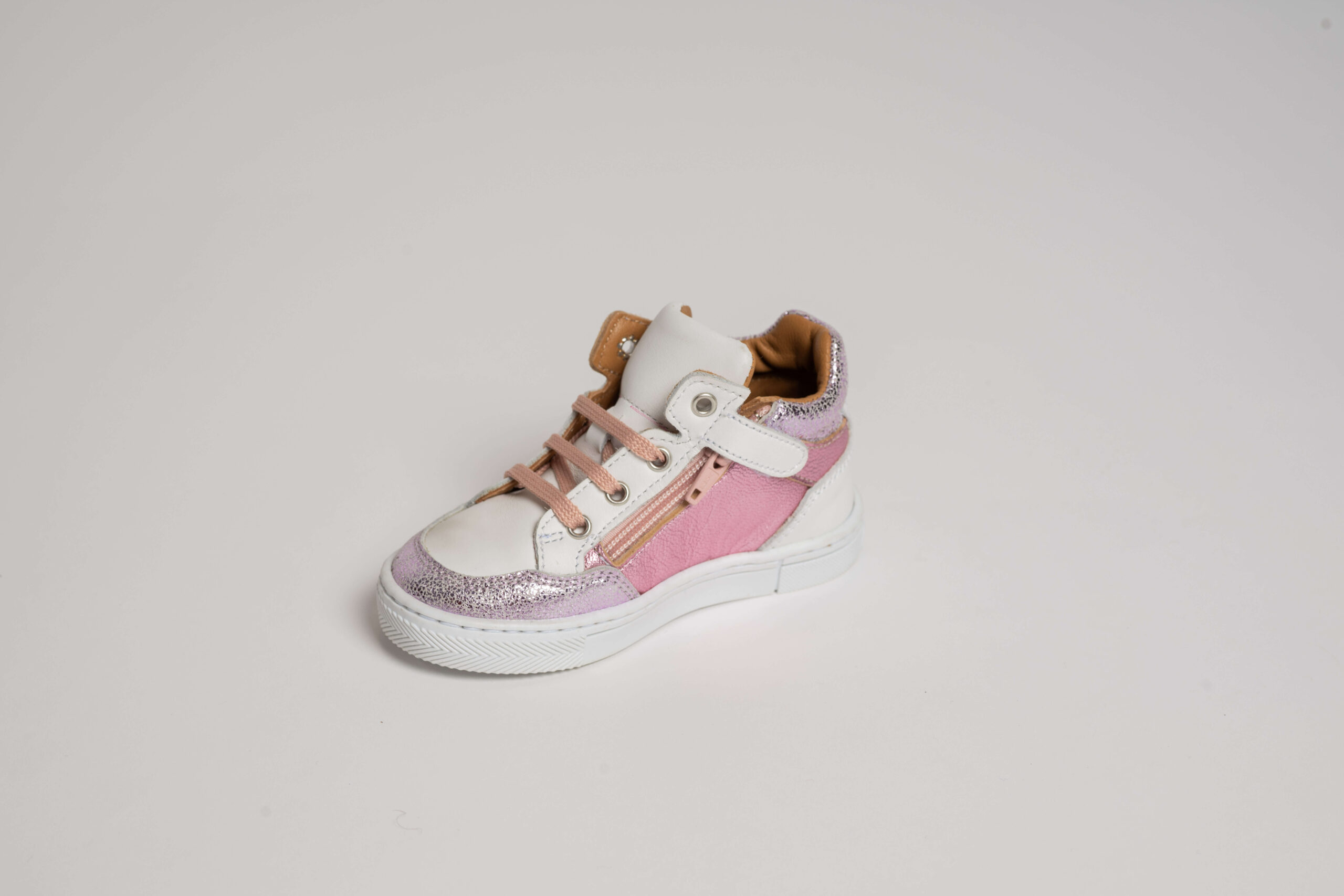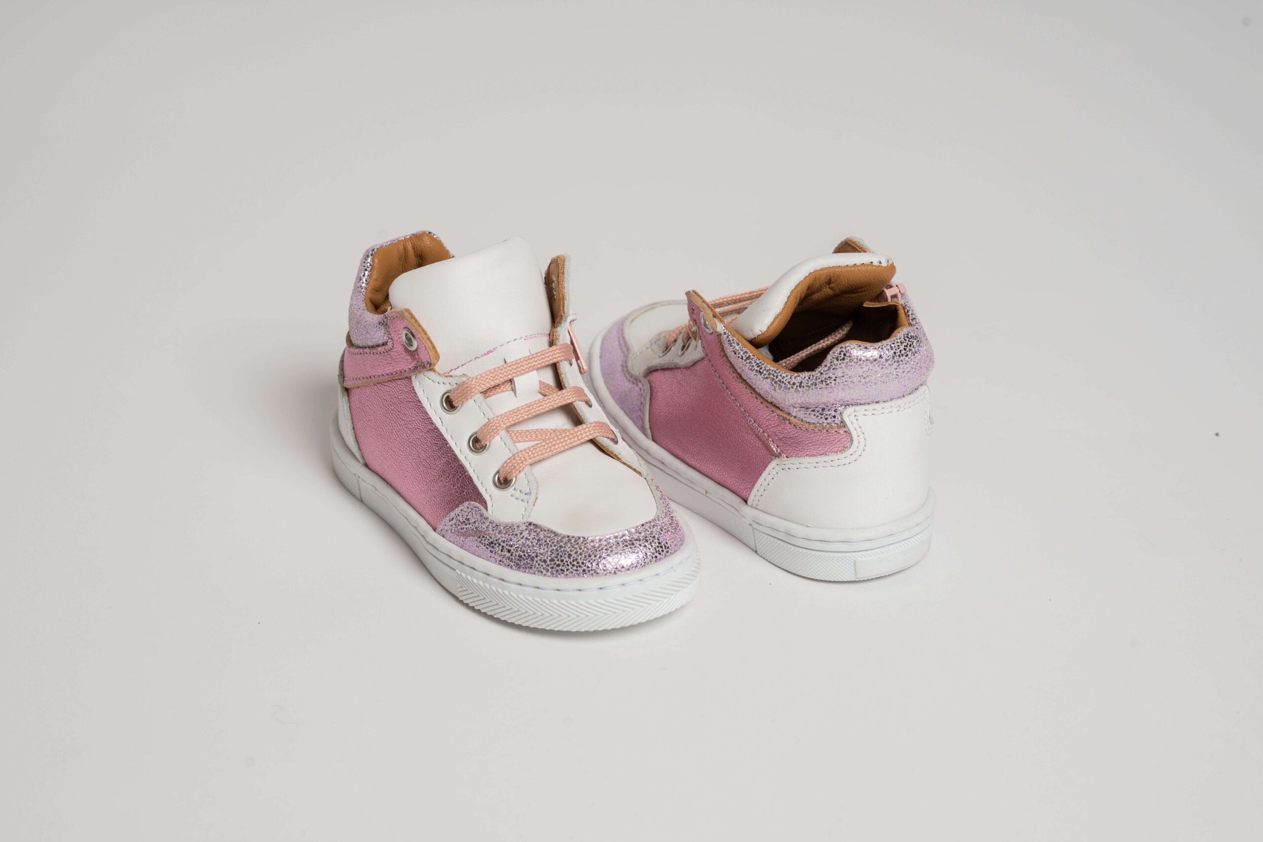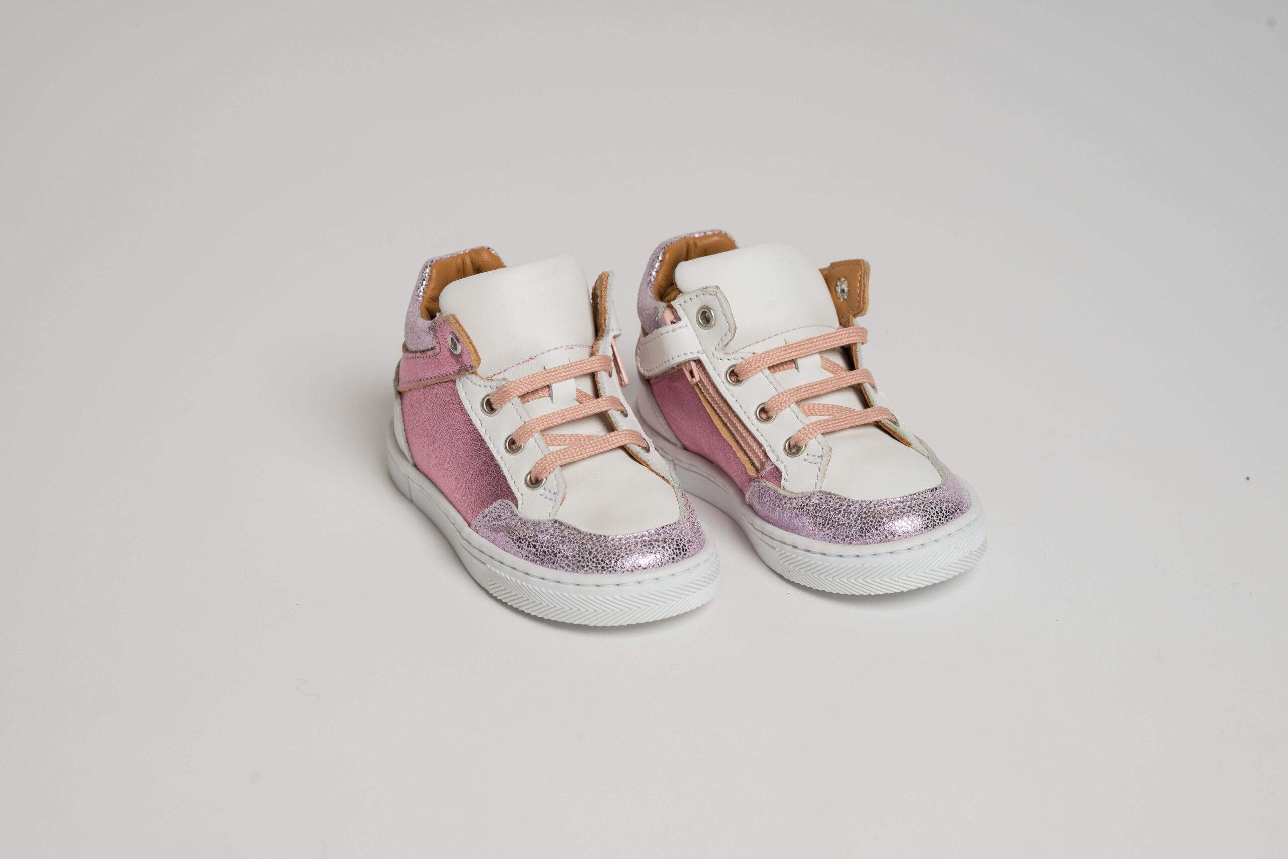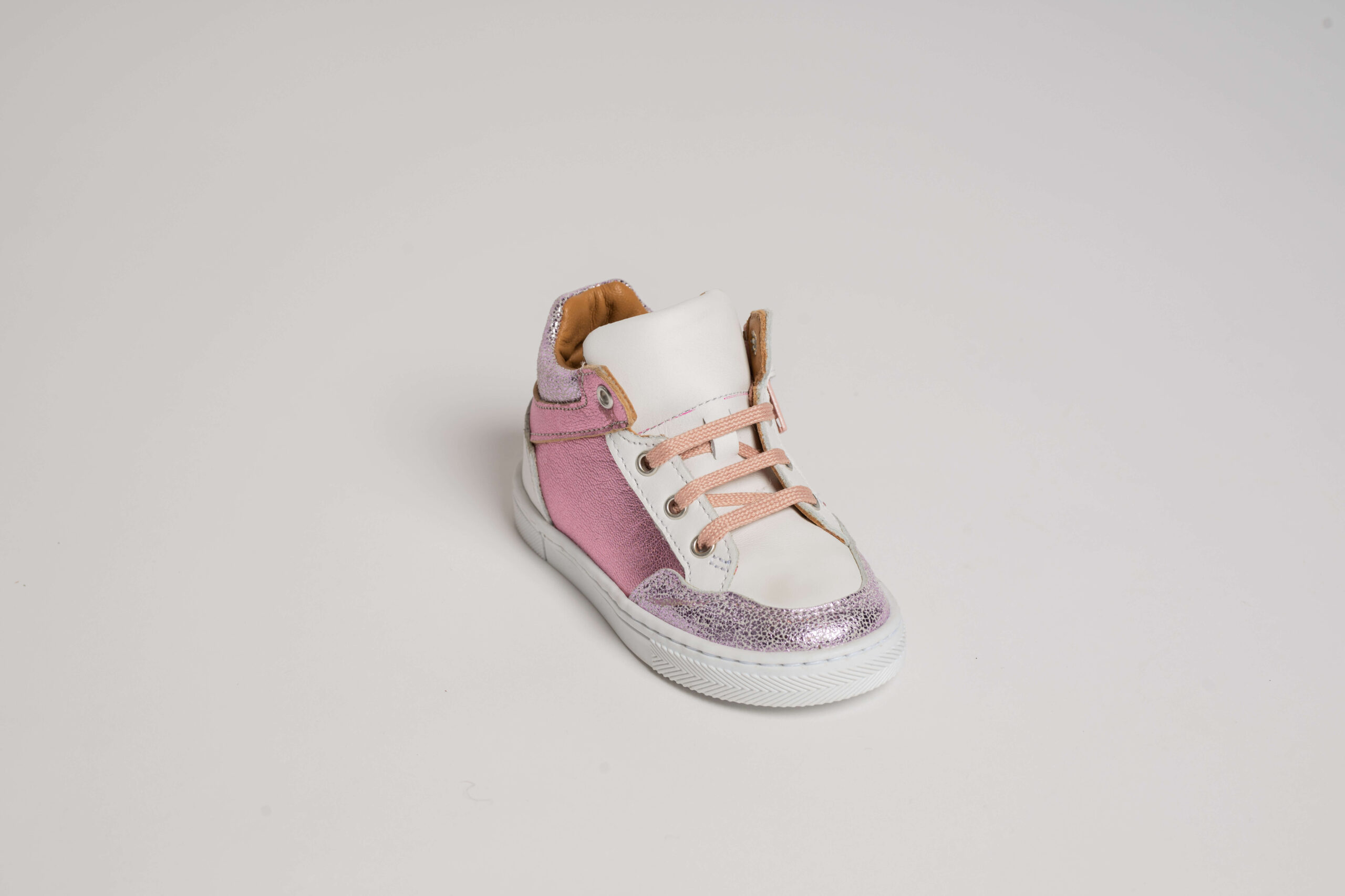 Ces baskets montantes bébé fille associent style et praticité pour le quotidien.Confectionnées en cuir 100 % naturel, elles offrent confort et souplesse, avec des semelles importées adaptées à l’âge.Le laçage permet un ajustement précis du pied, tandis que la fermeture éclair latérale facilite l’enfilage au quotidien.Le contraste entre le rose métallisé, les détails pailletés et le blanc apporte une touche moderne et lumineuse, idéale pour un look tendance tout en restant confortable.