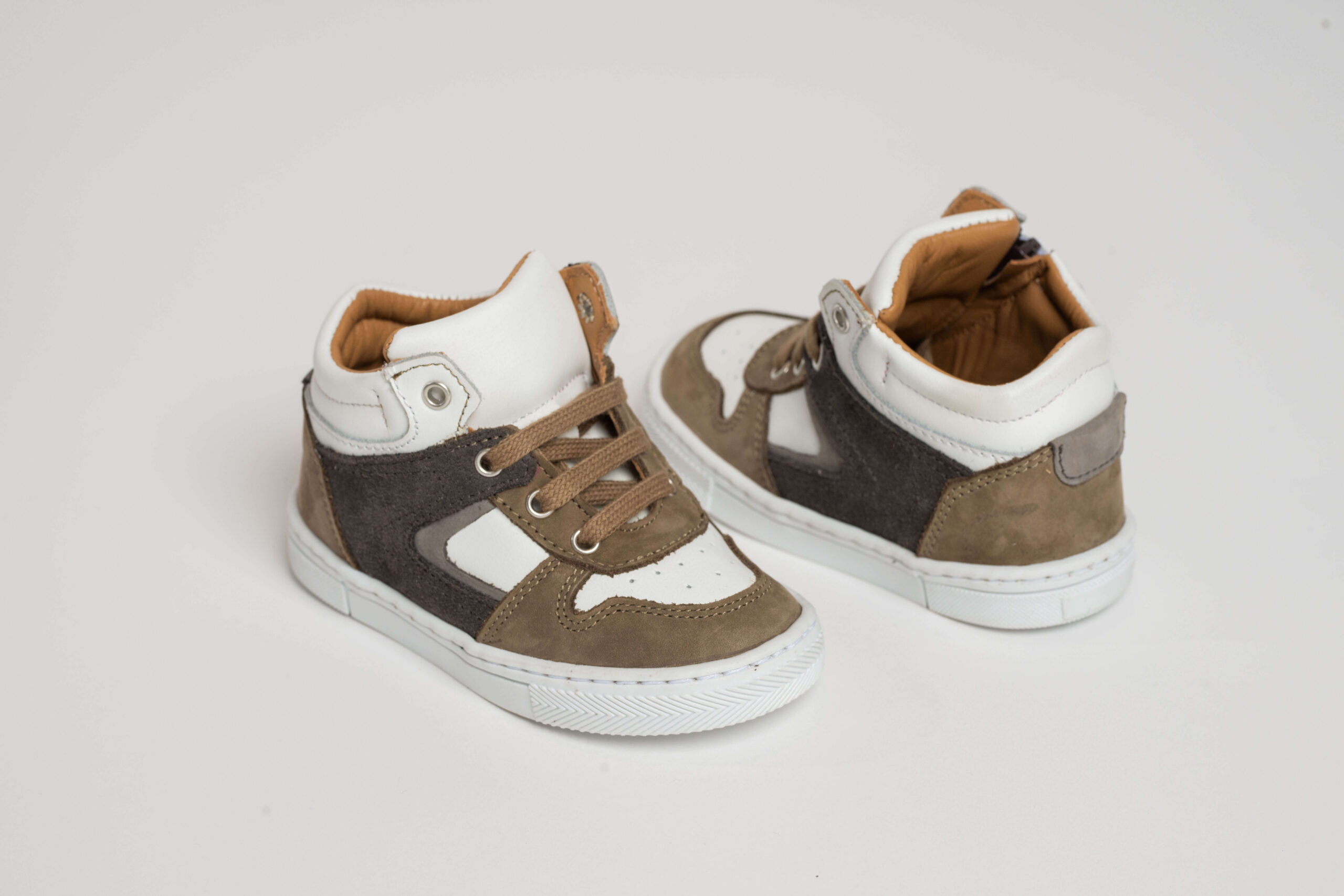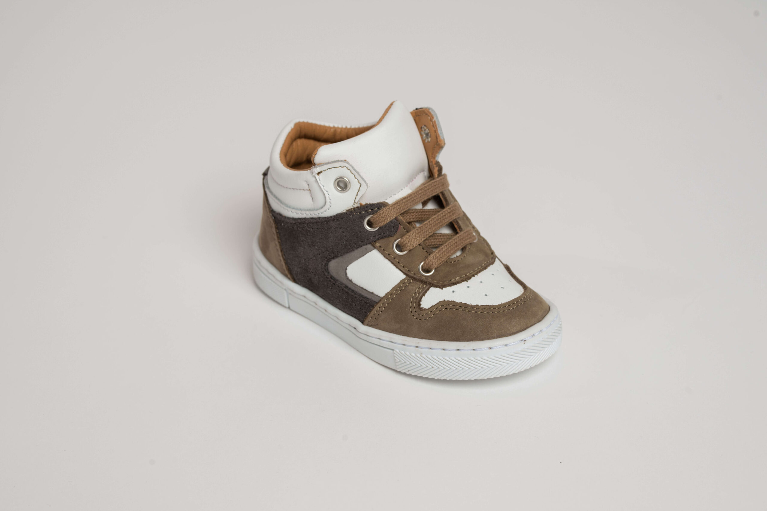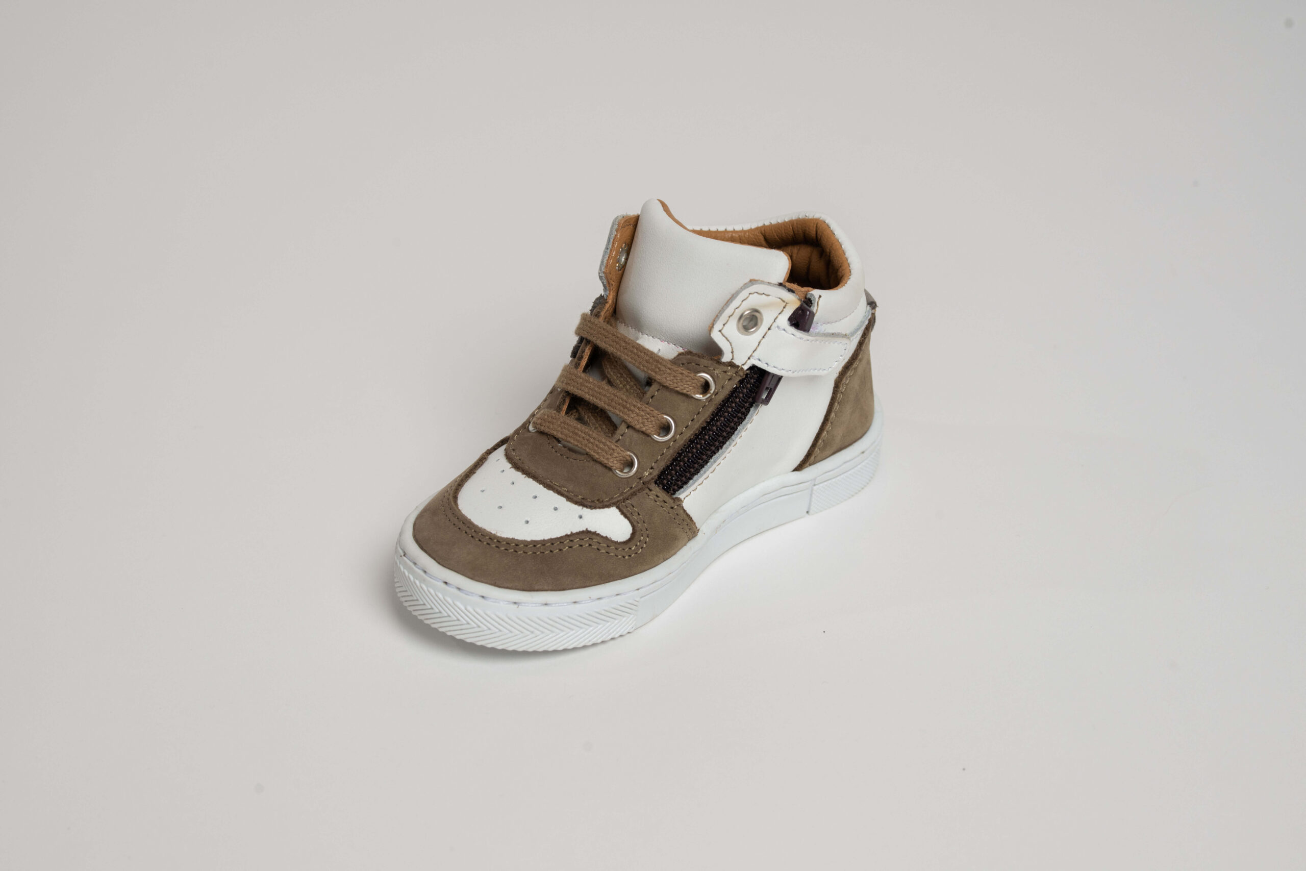 Ces baskets montantes en cuir sont conçues pour accompagner bébé dans ses premiers pas avec confort et stabilité. Leur forme montante assure un bon maintien du pied et de la cheville, idéal pour l’apprentissage de la marche.Les lacets permettent un ajustement précis, tandis que la fermeture zippée sur le côté facilite l’enfilage au quotidien. L’association de cuir blanc et de tons kaki et gris apporte un style intemporel et facile à assortir. La semelle souple et résistante accompagne naturellem