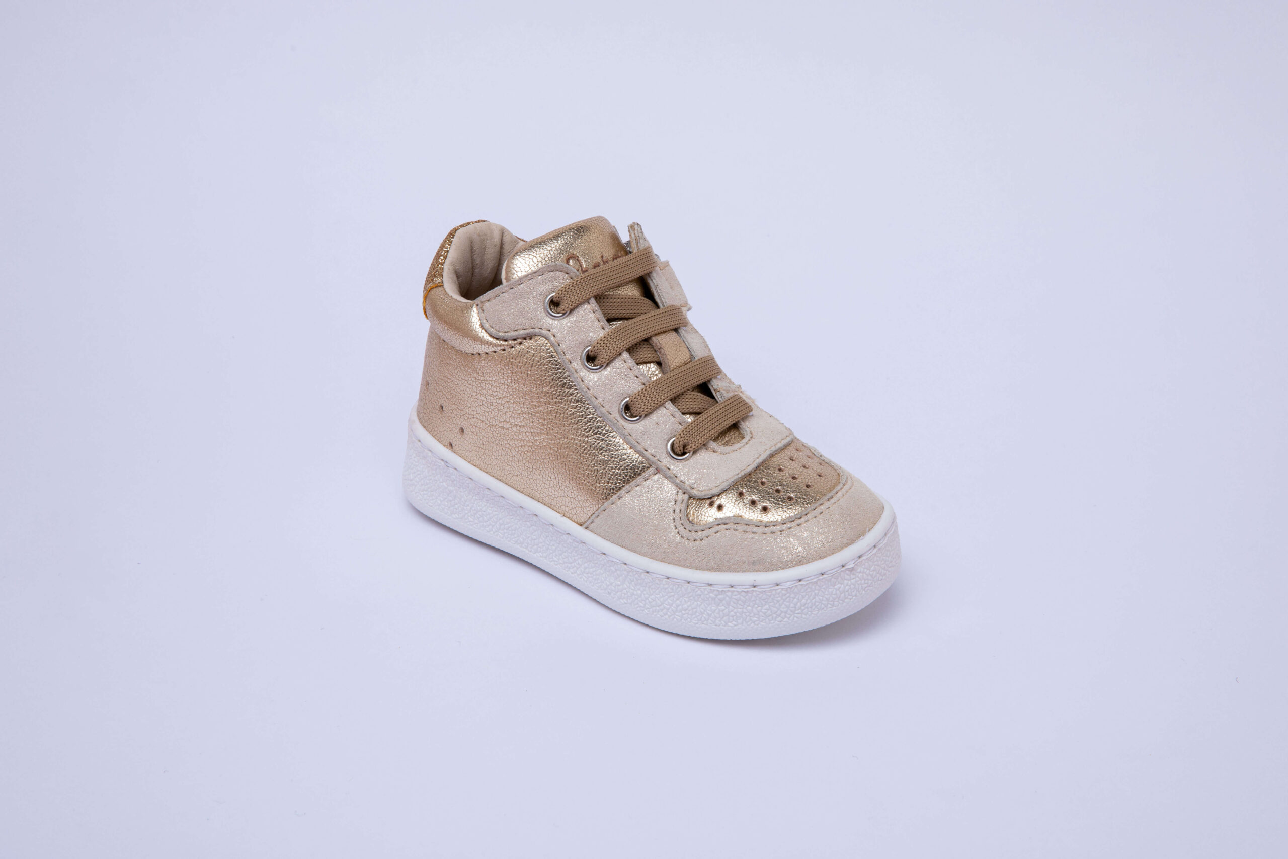 Ces baskets en cuir doré sont conçues pour garantir un confort absolu à vos bébés et une élégance sans pareille, tout en les accompagnant dans chacune de leurs aventures et de leurs premiers pas.