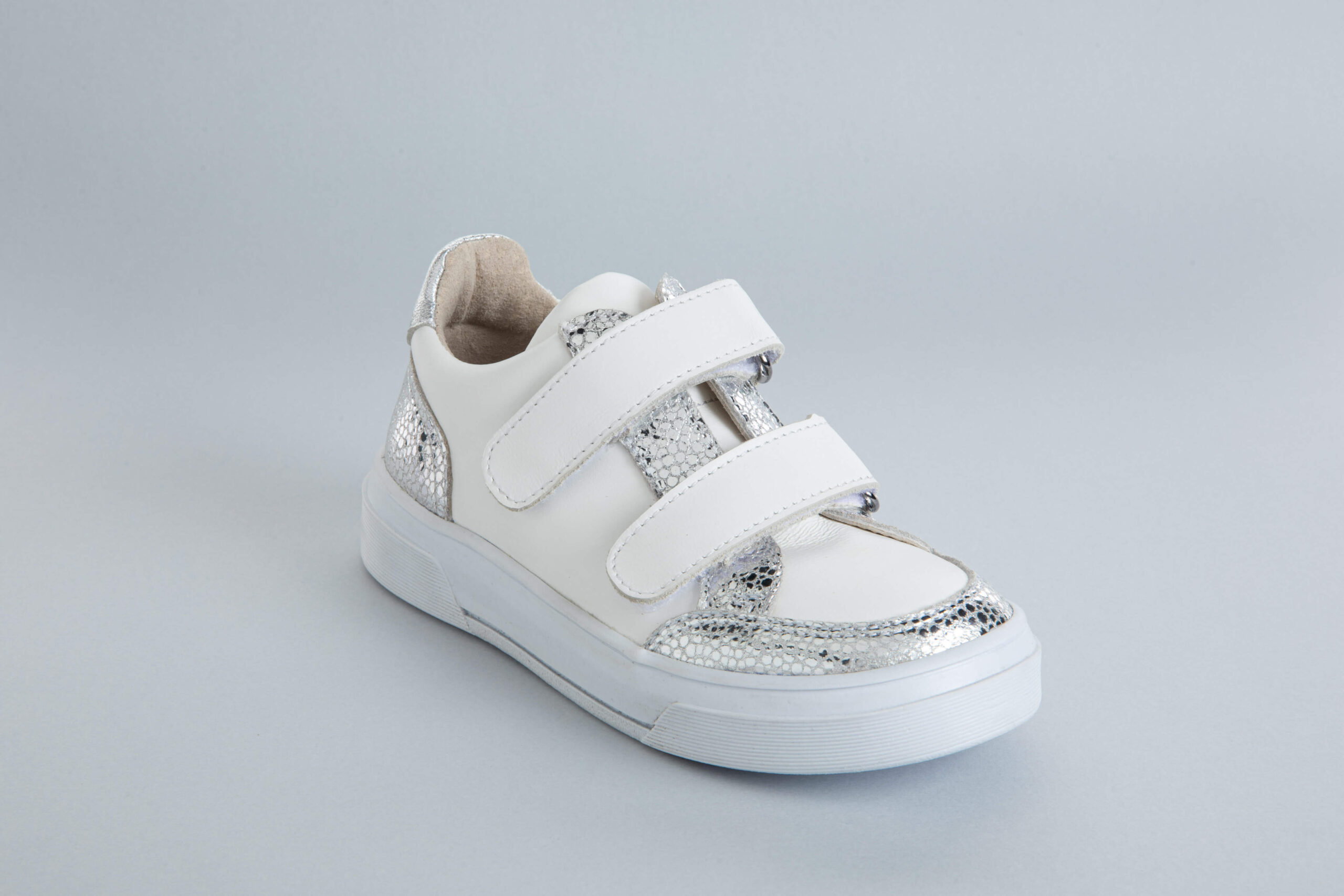 Baskets enfant fille en cuir blanc et en cuir fantaisie brillant argenté pour un look casual et branché. Ce modèle girly va faire craquer vos minis !